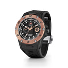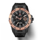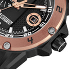 Black PVD coated stainless steel case with rose gold color ceramic bezel