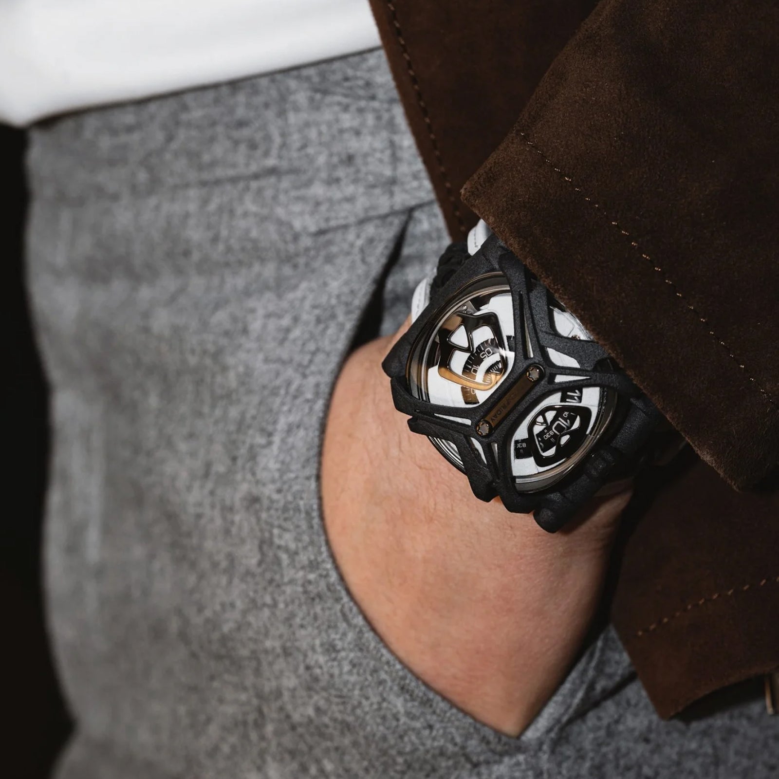 The material provided the perfect blank canvas for innovative design and ideas others would consider crazy. The inspiration behind the design is instinctive and visible. A futuristic approach to an amalgamation of vegetal and animal. Reminiscent of an insect, the ‘shell’ of the , produced in one part and snapped into place, protects the dial and movement. Not only is the design inspired by shapes we see in nature, but its look reflects the organic nature of the material.