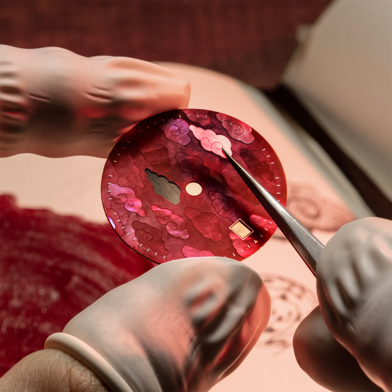 錶盤以手工鑲嵌紅色馬賽克珍珠母貝製成,凝練長安暮雲之輝,其上傳統雲紋流轉,寓意祥瑞。鍍金中文立體字時標,銘刻東方古韻。翻至底蓋,可見精雕之秦兵馬俑圖案與其上之古字「鎬」(西安古稱「鎬京」),將歷史厚重深藏於內。此作更將系列名譯為「海寧芙.雙時區」,融匯水城神話與實用功能。