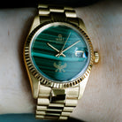 這款腕錶誕生於神話與優雅的交織中。其核心是充滿活力的孔雀石錶盤,點綴著蜿蜒的綠色圖案和古老的象徵意義,散發出自然之美和守護之力。盤踞於錶盤上方的精雕獵鷹,令人聯想到拉神的神聖使者,象徵遠見、守護和太陽能。這款36毫米自動腕錶採用鍍金錶圈,搭配同款錶鍊,將藝術性、傳承與雋永設計完美融合,令人嘆為觀止。